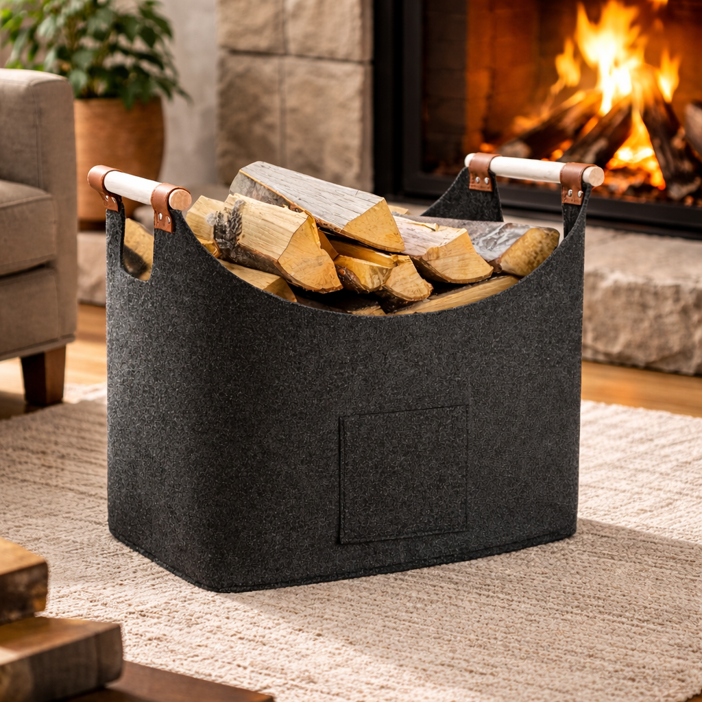Der FireNest™ Kaminholzkorb verbindet funktionales Design mit einer hochwertigen, wohnlichen Optik. Gefertigt aus reißfestem, formstabilem Filz bietet er eine praktische Lösung zur Aufbewahrung von Kaminholz im Innenbereich. Die ergonomischen Holzgriffe mit feinen Lederdetails sorgen für angenehmen Tragekomfort und machen den Korb zugleich zu einem dekorativen Element neben Kamin oder Holzofen.